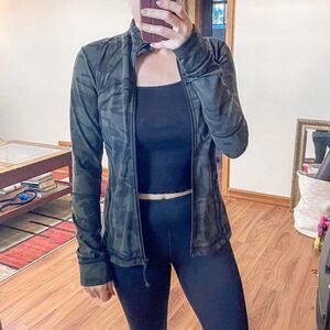 Features: long sleeves, thumbholes and cuffins, secure zip front pockets, sweat wicking, four way stretch, cottony soft feel, breathable luon fabric, body skimming, hip length, in dark green/ black camo
