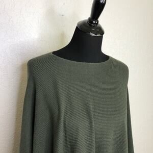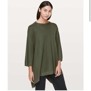 Lululemon Divinity army green ribbed knit poncho sweater. Pullover style with round neckline. Poncho style sleeves – stitching has come partially undone on one side. Ribbed trim. Size and material tag has been removed but size is One Size. Very good preowned condition. Minor wash wear.