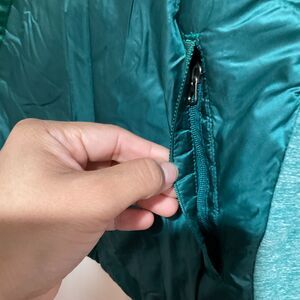Green Lululemon puffer jacket with a quilted design and ultra-warm goose down fill. Features thumbholes, fitted seams, and stretch side panels for flexibility and comfort. Made in Vietnam, designed in Vancouver.