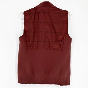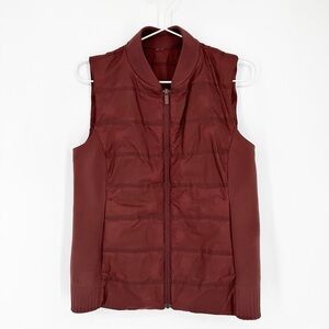 Super cute Lululemon Down and Around goose down puffer vest in a dark rusty red cedar color. Stylish, not too puffy puffer vest is zoned, insulated vest tailored for life on the move. The 800-fill-power goose down is featherlight. Glyde fabric is water-repellent. Stretchy side panels and back panels have four-way stretch and are sweat-wicking.