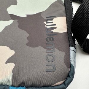 Lululemon Easy Access Camo Pink Blue Crossbody Fanny Pack Shoulder Bag. Water repellent fabric in pink, blue, gray and light green. Black adjustable strap makes it a
