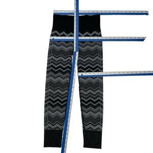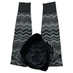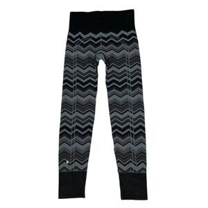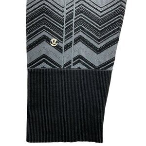 This Lululemon women's Ebb To Street Pant Legging makes a statement due to it's mid rise, seamless style, wide smooth waistband, sweat wicking, tight pull-on fit, ribbed texture, stretch, logo placement, black trim and gray/black chevron striped design.