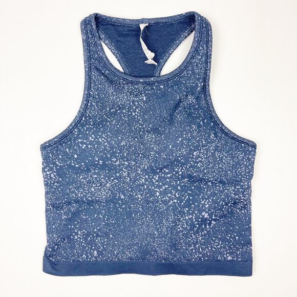 Splattered pastel blue on a mineral blue background cropped racerback Ebb to Street cropped tank from Lululemon in size 10. No flaws! Very good condition or better!