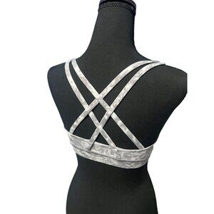 Crafted for active individuals, this Lululemon Energy Bra combines style and functionality. Its geometric print offers a modern look, while the comfortable fit ensures support during workouts. The crisscross back straps add a chic touch and provide added stability. Ideal for yoga or gym sessions, this bra is a versatile addition to any athletic wardrobe.