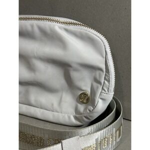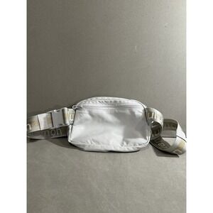 The Lululemon Everywhere Belt Bag is a stylish and functional accessory designed for women on the go. Made from lightweight nylon in an ivory color with pink, silver, and white opal accents, this rectangular-shaped bag features a zip closure and a crossbody strap handle style. Perfect for travel, casual outings, or business meetings, this 1L bag offers both fashion and functionality. The Lululemon brand ensures quality and the adjustable strap adds versatility to the overall design.