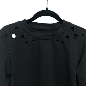 Lululemon Eyelet Space Crew in Black. Soft and breathable long sleeve sweater. Eyelets on front and back. Sweat wicking. Stretch French Terry fabric. Four way stretch. Cropped length.