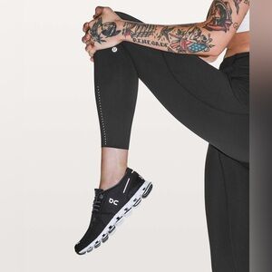 Classic black 7/8 leggings from Lululemon, perfect for early mornings or late night runs with its reflective detailing. In great preowned condition; no visible flaws. Pull tag has been removed but size dot is pictured!