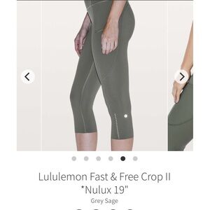 Lululemon Fast & Free Crop II Grey Sage 19” Nulux size 4.