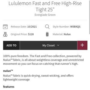 Lululemon Fast and Free Tight High Rise leggings in color Everglade Green with pockets. Excellent condition no rips or stains. Little to no pilling. Size 0 please see measurements pictures to be sure of fit. Length: 30in Inseam: 22.5in Retail: $128 If you like Lululemon check out my other Lulu listings! :)