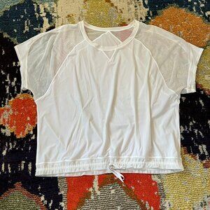 Designed with strategically placed mesh panels in high sweat areas, the Final Count Tee will take you through all of your sweaty sessions. Stretch fabric; tie to cinch at the hem. Oversized fit layers easily and give you room to breathe. Color is White; no size tag/dot, but measures like a 4 and could fit larger -- it is designed to have a very relaxed fit.