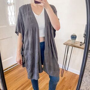 Features: open front wrap cardigan, short sleeves, V back, lightweight open mesh, charcoal grey