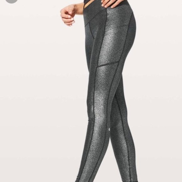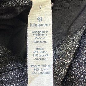 The shine effect on these leggings is so unique and visually interesting! In person, they appear black with a silvery shine. The fabric keeps the leggings up nicely while wearing and during activity. Pockets on the side of each leg and zip pocket on the back.