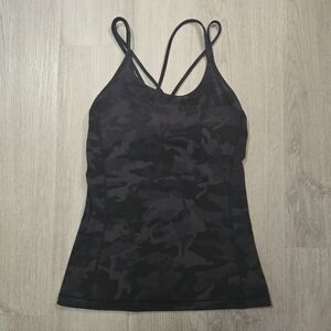 Nice Lululemon Athletica Free to Be Tank top, Size 4. Black camouflage pattern design with nice built in bust area that has slots for padding but no padding is included.
