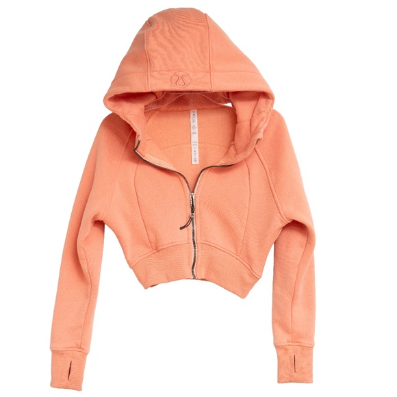 This Lululemon Full Zip Cropped Scuba Hoodie is a Sz 4. Awesome Peach Color! This is a very thick, quality material. Trendy fit that is oversized on top and hugs you at the waist. This hoodie is preowned and has some wear, most notable on the wrists. But over all, good shape and very cozy!