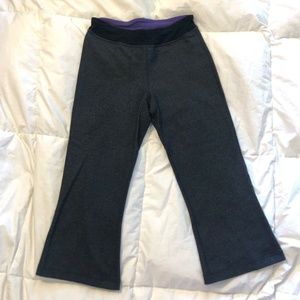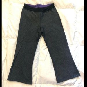 Cropped grey lululemon yoga pants. Purple waist band, flared bottoms. They are kind of speckled grey. Size 4.