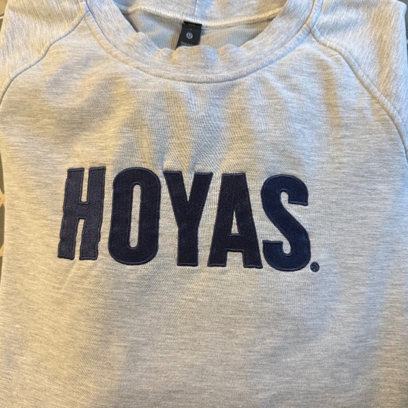 Grey Lululemon Georgetown University sweatshirt in large. “Hoyas” in navy on the front. One zippered side vent. Note the wear on cuffs in photo. Great used condition!