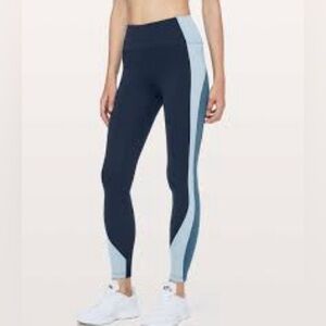 Lululemon Get Going Train Tight 28" in Blues - Size 4. Great pre-owned condition. Four-way stretch Full-On® Luxtreme fabric is sweat-wicking and offers great support and coverage with a cool, smooth feel. Colors are called True Navy / Cascade Blue / Thunder Blue