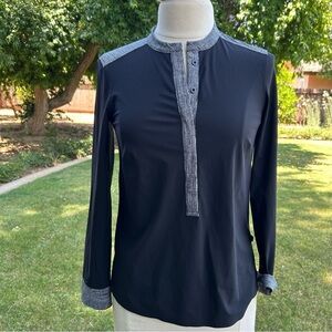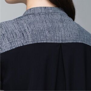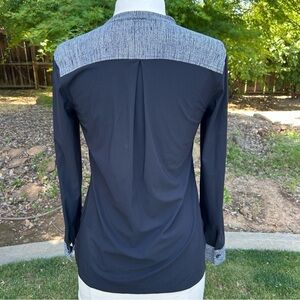 Such a versatile top. Lululemon Athletica Get It On Blouse. Two tone. Black Dune. Contrasting cuffs. Burlap Texture. Lightweight. 7/8 length sleeves. UPF of 50+ for ray protection. Very gently used . No visible flaws. Overall excellent condition.
