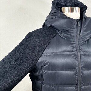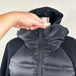 Lululemon Go Cozy Insulated Jacket Black / Black. Designed for: On the Move. 700 fill-power goose down is lightweight and warm. Storage: Zippered pockets with a hidden phone pocket. Cinchable hem. Glyde fabric is windproof and water-resistant. Windproof. Water-resistant. Glyde, Sherpa Fleece, Goose Down. Part puffer jacket, part sherpa fleece. *AI model cover photo.