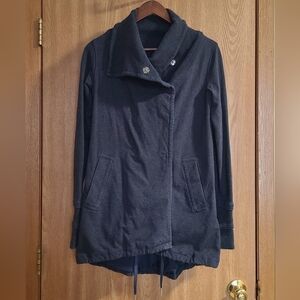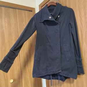 Lululemon gratitude wrap jacket in the color heathered inkwell (blue), size 6. Features: thumbholes, drawstring at the hem, high low hem, and built-in stretch. In good preloved condition. No flaws seen. Cotton and lyrica spandex blend.