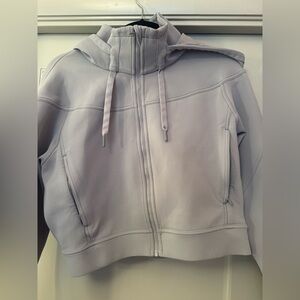 Cropped zip-up hoodie in Lululemon’s soft, breathable fleece (not heavy sweatshirt material). Features a high neck, hood with drawstrings, zip pockets, and thumbholes. Gently worn, small mark on the back shown in photos.