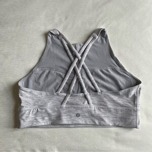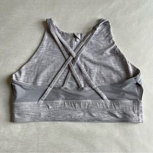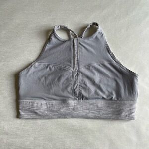 Stylish gray high-neck sports bra with a zip detail. Perfect for workouts.