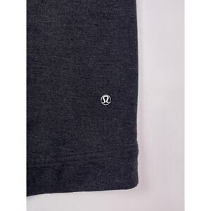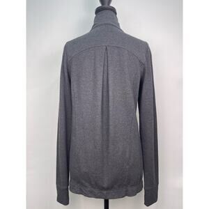 Cozy and stylish Lululemon wrap cardigan in heathered gray, size 4. Features a soft modal blend fabric with an asymmetrical front drape, cowl neckline, and versatile wrap style that can be worn open or closed with the button detail. Thumbholes at cuffs add extra comfort for cooler weather. Perfect for layering before or after workouts or for everyday casual wear.