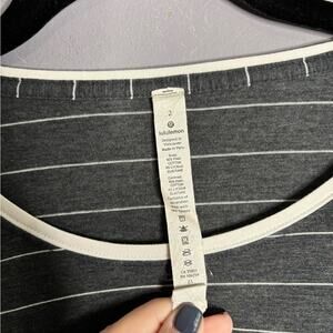 This Lululemon top is a versatile and comfortable piece, blending casual style with functional design. The top features a classic gray and white stripe pattern. The top offers breathability and a soft touch.