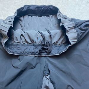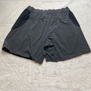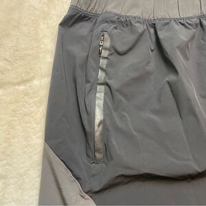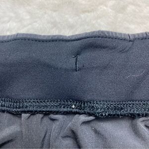 Lululemon Gray and Black Surge Athletic Shorts. Great used condition. No size tags. One stripe size stitch on waistband. Elastic waist with hidden drawstring. 2 front zipper pockets. Gusseted crotch. One very small snag on back left as shown in photo. Measures waist 30", inseam 7", rise 12".