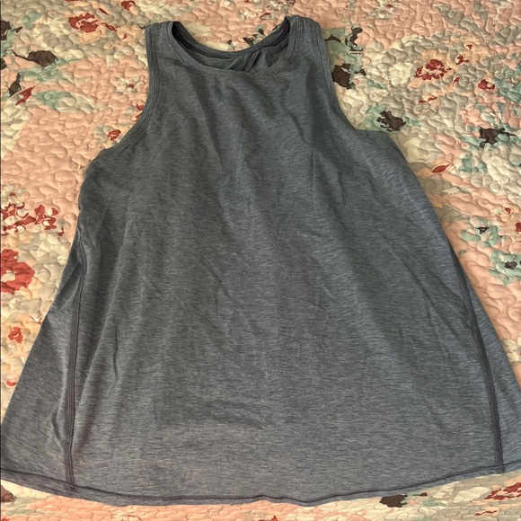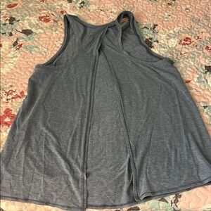 Soft grey racerback tank with a center back split detail. Lightweight drapey fabric and casual fit. Versatile everyday layering piece.