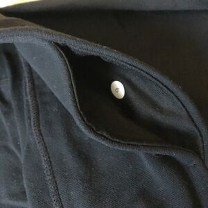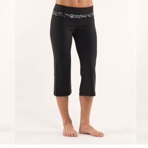 Black stretchy crops. Have been used a fair amount. There is some piling from usage on the inner thigh. In general in good condition. Always washed with no fabric softener and air dried.