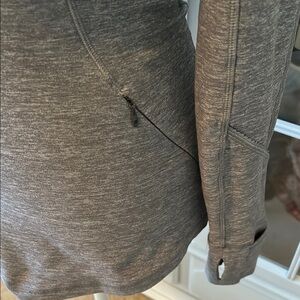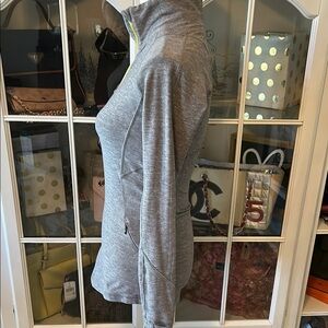 Lululemon Stylish gray women's top featuring a vibrant yellow zipper. Perfect for casual outings or active wear. Has thumb holes and reflective in the sleeves. Two way zipper. Size 4