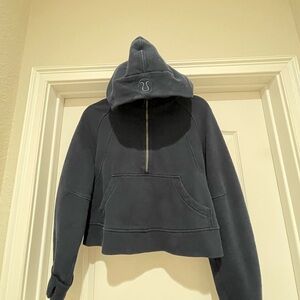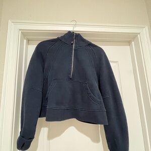 Stylish Lululemon Navy half-zip cropped sweatshirt with a front pocket.