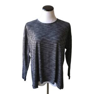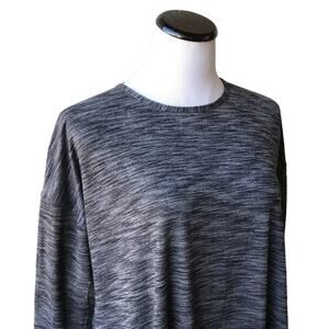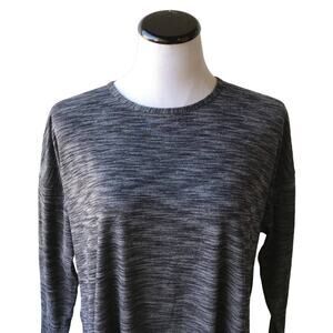 This loose layer provides breathability and warmth as you transition from the steamy studio to the chilly outdoors. Stretchy, naturally breathable RULU. Light fabric is sweat wicking. Loose fit, bum length. Longer at the back than the front. Pulls on. Long sleeves. Color is heather gray. Nylon / polyester / lycra. Machine wash. W3BJ0S. In preowned condition, some minor fabric wear. Also shown on the model in black to show fit.