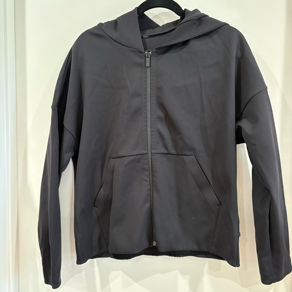Stay stylish and comfortable with this sleek black hooded jacket. Perfect for any casual outing.