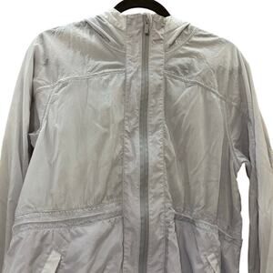 Pre-owned Lululemon hooded lightweight jacket in a soft purple shade. Features a full zip front, hood, zip pockets, mesh lining, and longer curved hem for extra coverage. Lightweight and breathable — perfect for layering.