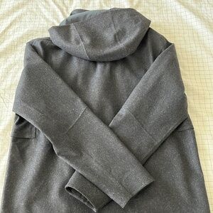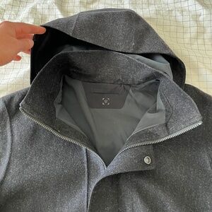 Lululemon Hooded Wool Rain Jacket. Hood is removable. Men's Large. Black. Two snap closures at wrist to keep rain out. Interior pockets.