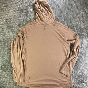 The Lululemon Hoodie Shirt for men in size L features a solid brown color with a crew neck and long sleeves, making it a stylish and versatile addition to your activewear collection. This pullover shirt is made of a blend of polyester, nylon, and spandex, offering lightweight comfort and breathability. With features such as being hooded, tagless, moisture-wicking, and suitable for activities like gym training, walking, yoga, and running, this shirt is designed to keep you comfortable and dry during your workouts. Perfect for everyday wear or athletic pursuits, this hoodie shirt from Lululemon is a reliable choice for active men.