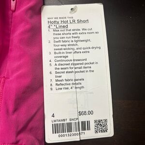 Lululemon 4" never worn. https://shop.lululemon.com/p/women-shorts/Hotty-Hot-Short-HR/_/prod9250076?color=31382&locale=en_US&sl=US&sz=12&cid=Google_SHOP_US_NAT_EN_X_BrandShop_Incr-All_OMNI_GEN_Y24_ag-SHOP_G_US_EN_DM_W_GEN_NO_Bottoms-Shorts&gclsrc=aw.ds&gad_source=1&gad_campaignid=21471260535&gbraid=0AAAAADL8AvnrBuPCObJITEvir3xpT638r&gclid=Cj0KCQjw3OjGBhDYARIsADd-uX6AggmwNXKPqWLE3PbW0pJheVj6IohyIJVrc6BZdaSLISvcw5u2Ds4aAiL3EALw_wcB