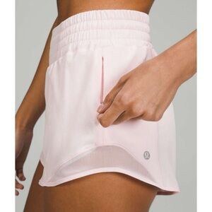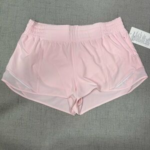 Lululemon Hotty Hot Gym Shorts in Strawberry Milkshake, which is a light pink. High Rise. 1 zippered pocket on the side. Has an elastic waist and drawstring. Built in liner. Quick dry stretchy material. New with tags. 2.5” inseam. Size 12.