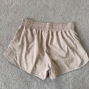 Stylish beige shorts with an elastic waistband and inner liner. Perfect for casual wear or running. This is the 2.5 in inseam. No tags, but is like new.