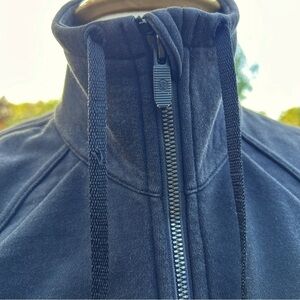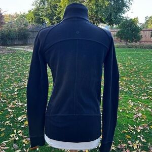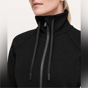 Fantastic condition Lululemon full zip jacket with high neck with lace pulls. Branded zipper pull and logo on back. 2 front pockets. Thumb holes (minor snag on cuff) Banded at cuff and bottom. Ready to wear!