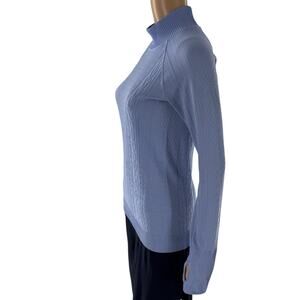 A chill in the air calls for a chill busting layer. Wear this sweat wicking mock neck under your raincoat or ski jacket to stay warm, dry, and comfortable. Four way stretch. Designed for on the move. Thumbholes help keep your sleeves in place and hands warm. Body skimming, hip length. Long sleeves. Pulls on. Logo at hem. Fabric tag removed, contents are 73% nylon, 24% polyester, 3% elastane. Machine wash. W3BKJS. In preowned condition.