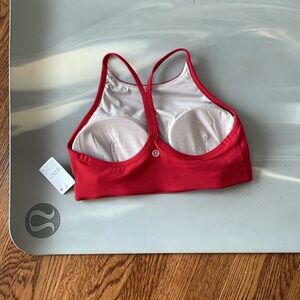“The buttery-soft yoga bra you love, with a twist. We added a higher neckline for coverage and flat front-seam details for a wrapped look without any extra layers of fabric.