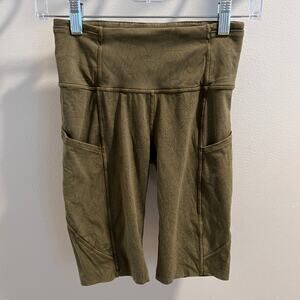 These Lululemon shorts are moss green in color and a size 4. They have been previously owned and are in good used condition