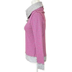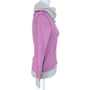 Lululemon In A Cinch Long Sleeve Tee Sz 4 *READ Reversible Gray/Raspberry Stripe. Top is in good preowned condition. Size tag has been removed. I estimate it's a size 4; please refer to measurements for best fit. (Top is pictured on a size 6 dress form.) Cinched cowl neck with elastic drawcord. Cinched in front below neckline. Long sleeves with thumbholes on cuffs. Double-knit cotton modal blend. Reversible design in solid heathered gray on one side and raspberry and heathered gray stripe on the other.