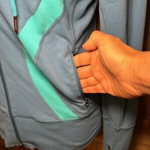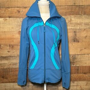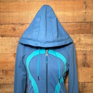 Lululemon In Stride Jacket. Some slight wash wear. Full front, double zip closure. Big collar to provide neck coverage. Has drawstring hood. Older model jacket, no size dot, I'm guessing a size 6 but please refer to measurements to ensure fit. Blue and aqua color way with Lululemon logo on front. Great jacket for layering on cooler days.