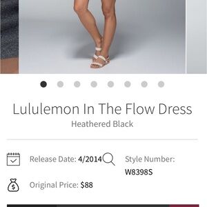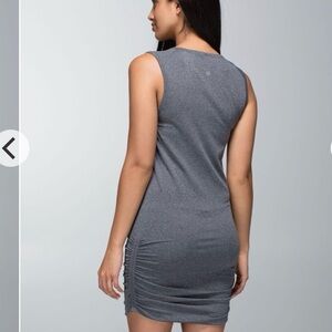 Lululemon In The Flow Ruched Dress. Heathered Black (gray). Excellent condition. Was sold to me as size 6 but is actually a size 4 (see photo for size in hem). Just want to sell and buy a size 6. Super cute fit.