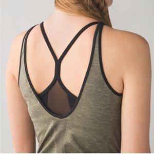 Lululemon In The Flow Tank in heathered fatigue green. The size tag has been removed but fits like a small, I would guess that it’s a size 6. Features a high neck front and a low back with ruched sides. Super comfortable and very flattering. Excellent condition.