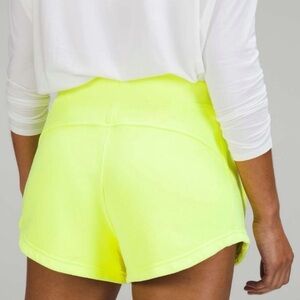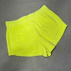 Lululemon Inner Glow High Rise Short 3" Neon Wash Yellow Highlighter. Cotton terry fabric with a high rise and 3" inseam. Pockets on the sides. Drawcord and elastic waistband. Like new. Size 12.